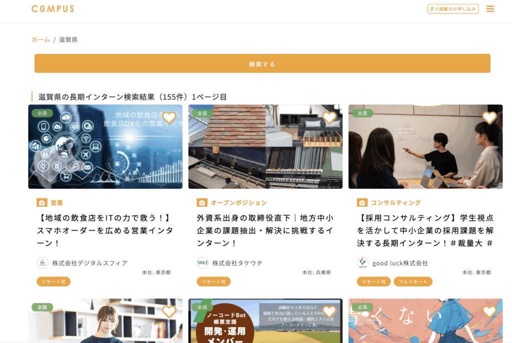 地方学生向けの「リモート・長期インターン」求人サイトで、滋賀県ページには長期インターン結果155件が並び、エリア・職種・タグで細かく絞り込み可能です。