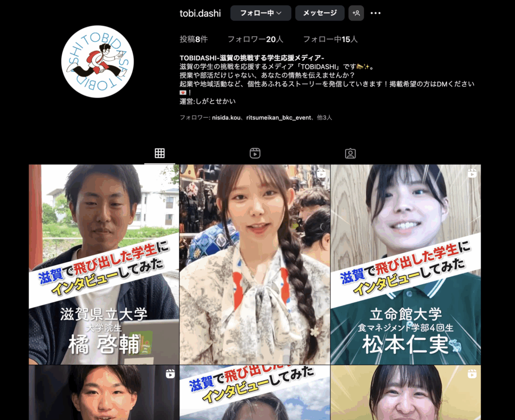 「滋賀の挑戦する学生を応援するインタビューメディア」として運用される公式Instagram。プロフィールで“授業や部活だけじゃない、あなたの情熱を発信”と掲げ、リールでは学生の挑戦・起業・地域活動を短尺動画で発信。立命館大学など県内学生のストーリーを切り取り、地域×学生の接点を増やす編集方針が特徴です。ハイライト的に企画リールが並び、地元の若者像を具体的に可視化。
